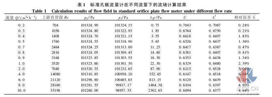 ( 1) 基于 ANSYS - CFX 的差壓式孔板流量計數值模擬,可清晰直觀地得到縮徑管段內部流場分布。數值模擬的流出系數值與基于理論公式編程計算值誤差小、吻合度高,可結合具體場合應用于工程實際。
