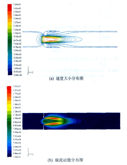 圖6流體(水)速度分布云圖 圖7流體(水)湍流動能分布云圖